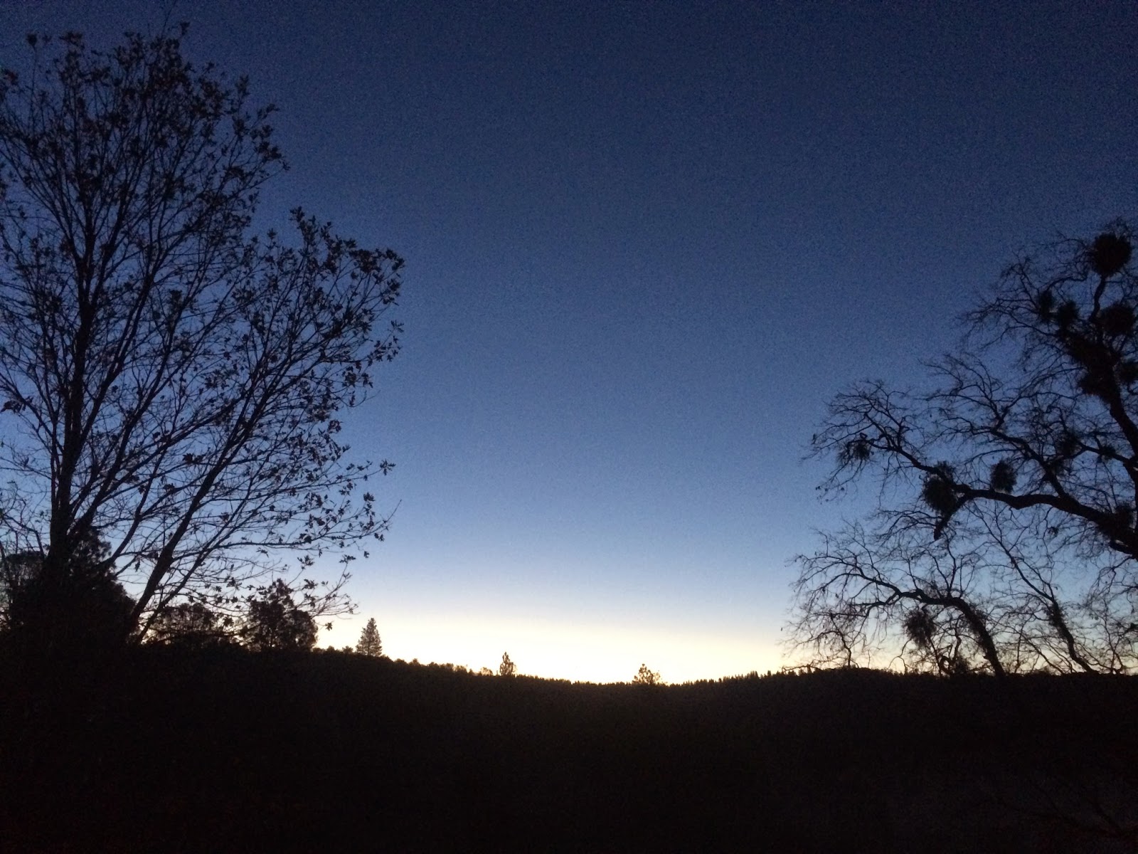 It may not compare with some of the spectacular sunrise photos, but after days of rain and wind it's very nice to see any sunrise. Up until yesterday, it had been a pretty warm storm, and then the temperature dropped. Snow levels crept down the mountain and it took forever to get the house warmed up. It's in the mid 30s this morning. My neighbor's vineyard and my south pasture are covered in a low ground fog, but I don't see a cloud in the sky.